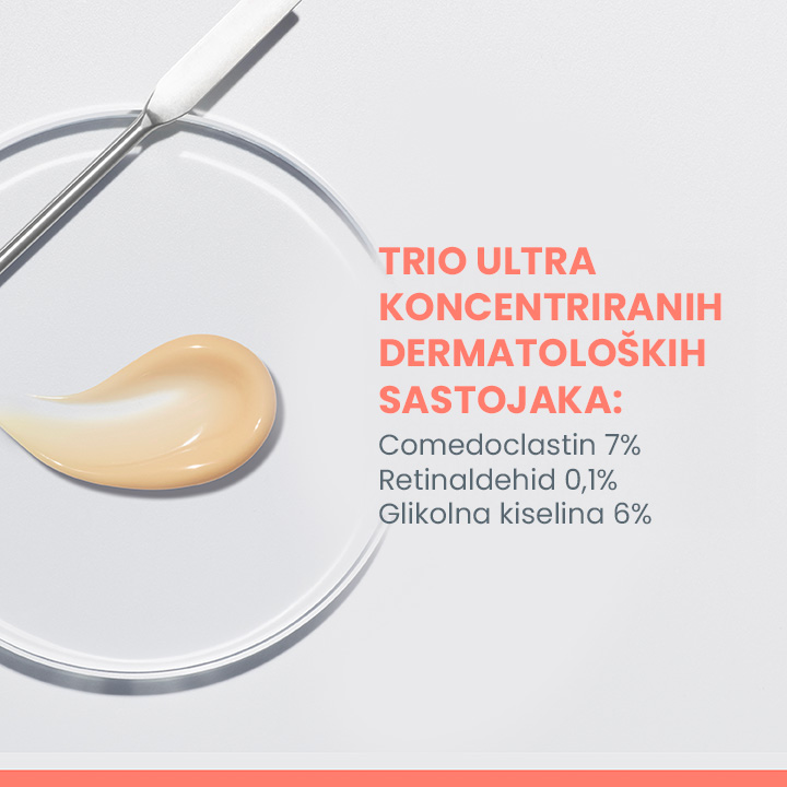 – retinoid booster: potiče resorpciju prištića i smanjenje zaostalih tragova zahvaljujući patentiranoj** kombinaciji retinala, najučinkovitijeg oblika vitamina A, i Comedoclastina ™.